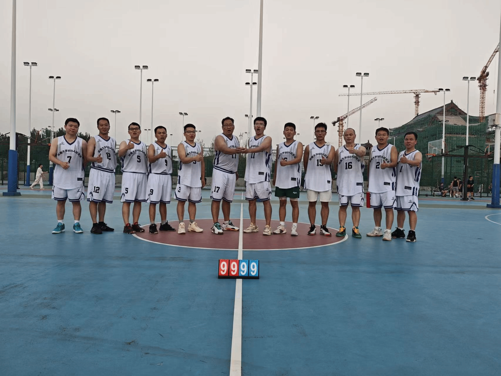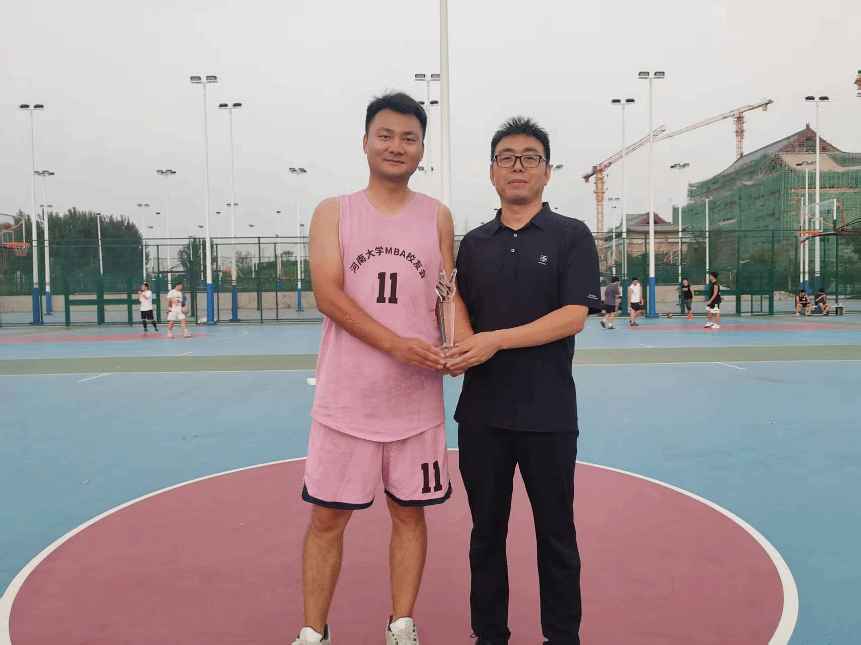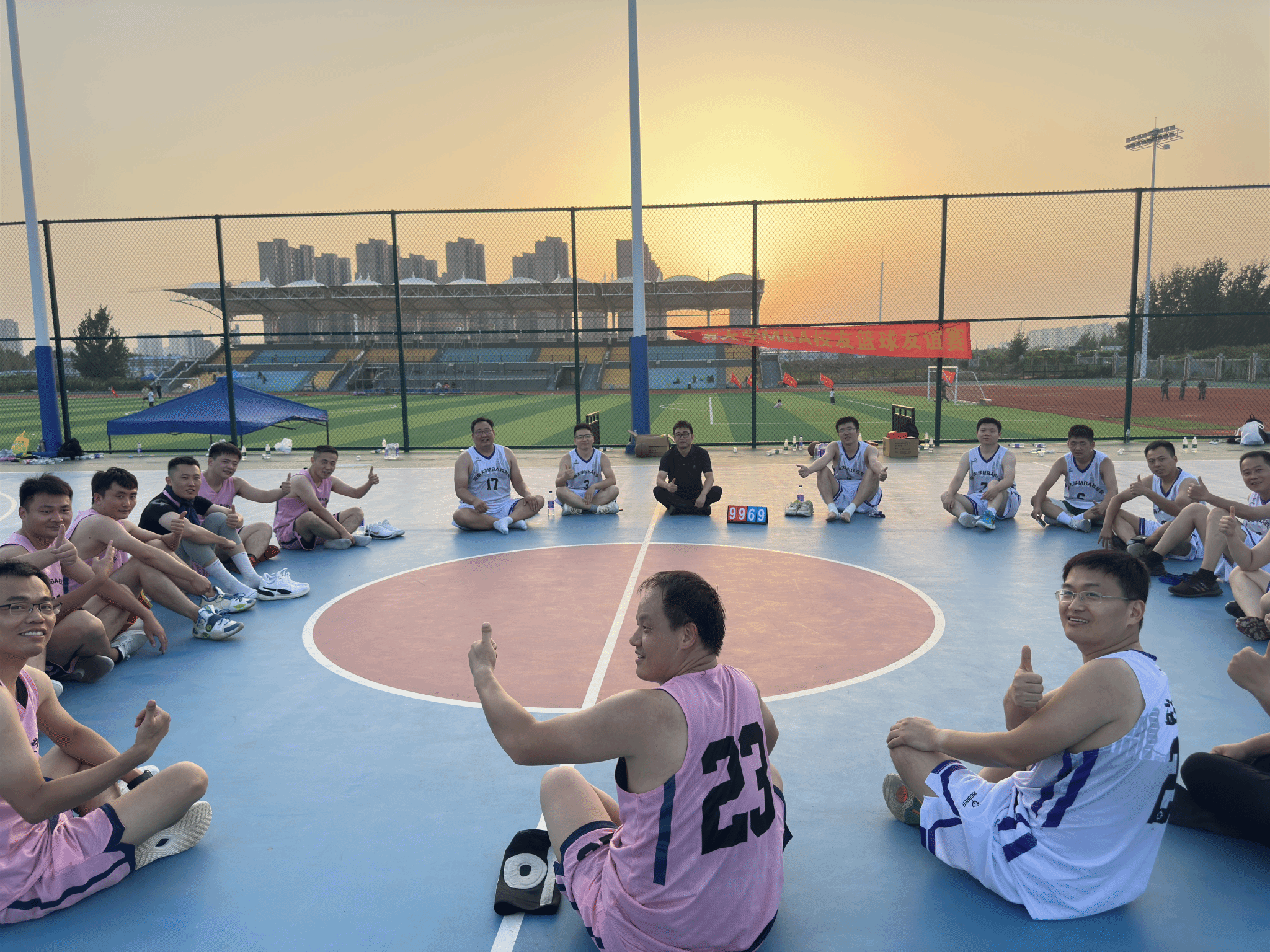 颁奖环节结束后,夕阳渐渐西沉,为龙子湖校区镀上了一层温暖的金边,粼粼湖光与绚烂晚霞交相辉映,营造出温馨的氛围。所有参赛队员与活动组织人员围坐在篮球场中心场地,卸下赛场的紧张与疲惫,开启了轻松愉快的交流。在交流过程中,惊喜不断 —— 有人意外找到了来自同一城市的老乡,乡音乡情瞬间拉近了彼此的距离;有人发现与身边的校友曾在同一家企业工作,共同的职场经历让两人有了更多共同话题;更有校友在交流中发现双方业务存在契合点,当场就开启了关于合作可能性的初步探讨。这场以球会友的盛会,不仅留下了赛场上的热血瞬间,更种下了校友情谊的种子。未来,必威官网 MBA 校友会将继续以多样的活动为载体,连接校友、服务校友,让校友情谊在时光中沉淀,让合作之花在交流中绽放,共同书写必威官网 MBA 校友群体的精彩篇章。