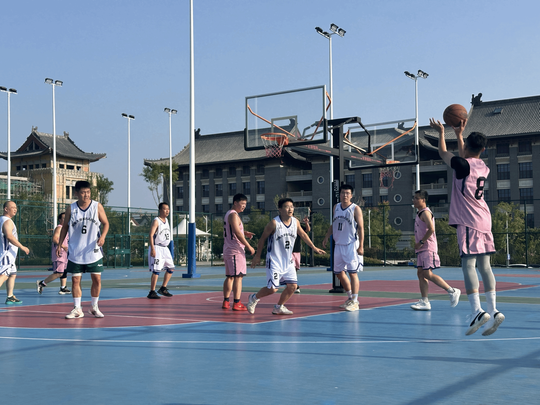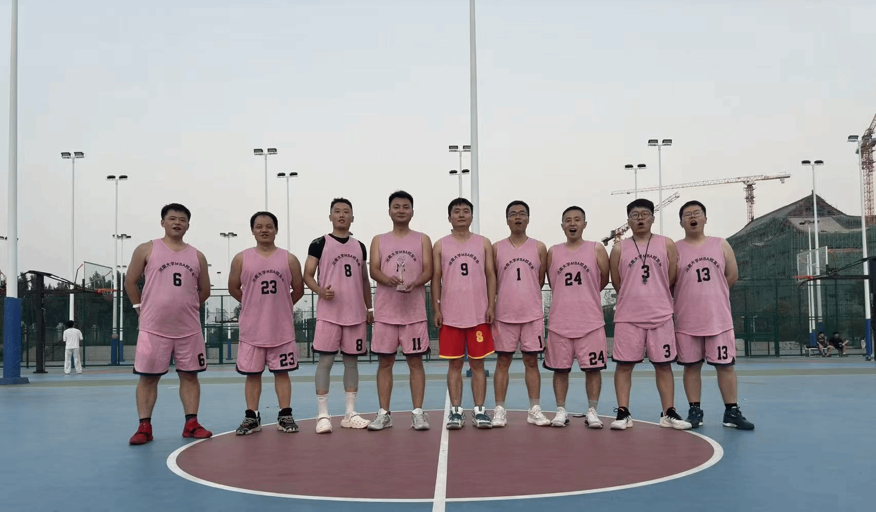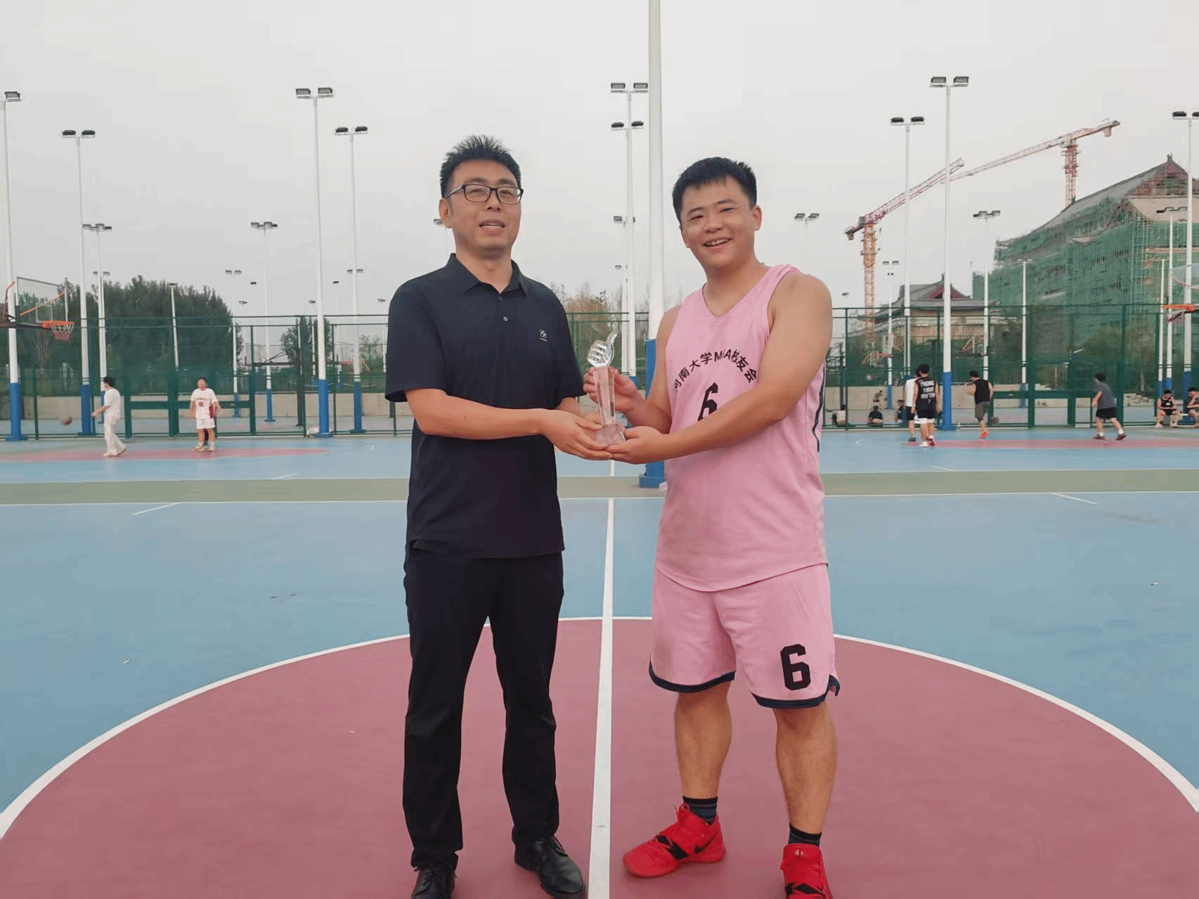 颁奖环节结束后,夕阳渐渐西沉,为龙子湖校区镀上了一层温暖的金边,粼粼湖光与绚烂晚霞交相辉映,营造出温馨的氛围。所有参赛队员与活动组织人员围坐在篮球场中心场地,卸下赛场的紧张与疲惫,开启了轻松愉快的交流。在交流过程中,惊喜不断 —— 有人意外找到了来自同一城市的老乡,乡音乡情瞬间拉近了彼此的距离;有人发现与身边的校友曾在同一家企业工作,共同的职场经历让两人有了更多共同话题;更有校友在交流中发现双方业务存在契合点,当场就开启了关于合作可能性的初步探讨。这场以球会友的盛会,不仅留下了赛场上的热血瞬间,更种下了校友情谊的种子。未来,必威官网 MBA 校友会将继续以多样的活动为载体,连接校友、服务校友,让校友情谊在时光中沉淀,让合作之花在交流中绽放,共同书写必威官网 MBA 校友群体的精彩篇章。